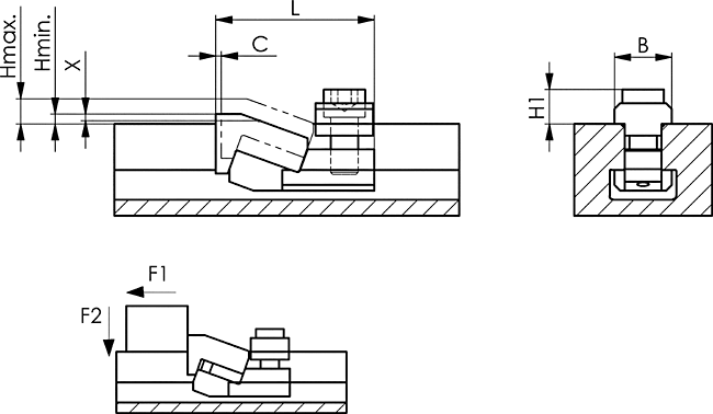 | № заказа | Паз | H мин. | Н мах. | B | C | H1 | L | X | F1 [kN] | F2 [kN] | Вес [g] |