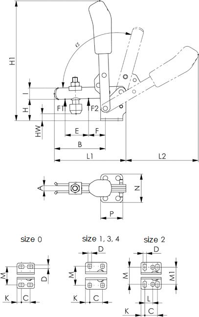 | № заказа | Размер | A | B | C | D | E | F | H | H1 | HW мин. | HW макс. | I | K | L1 | M | N | P | альфа | альфа* |