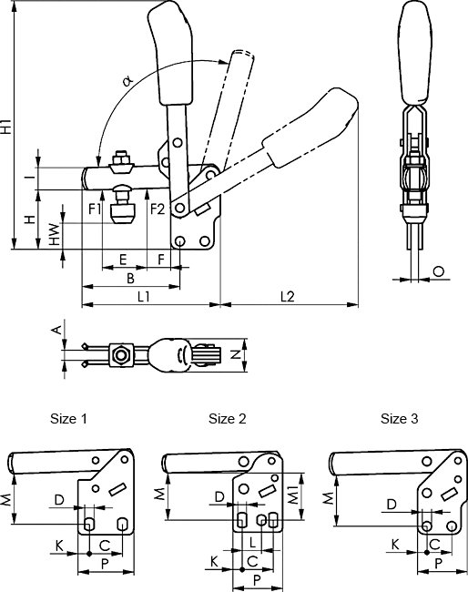 | № заказа | Размер | A | B | C | D | E | F | H | H1 | HW мин. | HW макс. | I | K | L1 | M | M1 | N | O | P | альфа | альфа* |