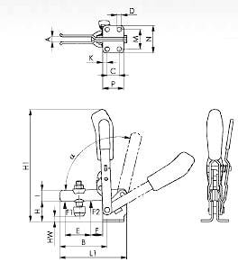в закрытом и открытом положении. С открытым зажимным рычагом и вертикальной опорой. Оцинковано и пассивировано. Заклепки из нержавеющей стали, двигающиеся в закаленных опорных втулках. Опорные участкисмазаны. Эргономичная, маслостойкая ручка с большим подручником и мягкой вставкой. Предохранительный зажимной элемент с защитой для пальцев, Устройство для предотвращения потери прижимного винта на конце зажимного рычага. В комплекте с оцинкованным прижимным винтом № 6890 из улучшенной стали.
