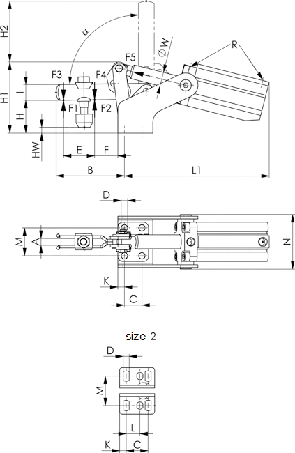 | № заказа | Размер | A | В | С | D | Е | F | H | H1 | H2 | HW мин. | HW макс. | I | К | L | L1 | M | N | R | Диам. W | Диам. поршня |