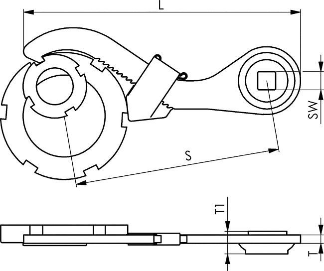 Разводной гаечный ключ с гнездом AMF № 771Md Разводной гаечный ключ AMF под отверстие динамометрического ключа. Серповидный ключ для круглых шлицевых гаек для контргайки DIN 1804 и для гайки DIN 981 .