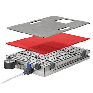 Преимущество: - Хороший коэффициент трения обеспечивает особенно хорошее сопротивление возникающим усилиям смещения во время обработки. - Можно спокойно снять фрезой до 2 мм глубины адаптерного мата. - При постоянном применении одинаковых контуров адаптерный мат может использоваться почти неограниченное количество раз, поскольку не подвержен износу. |