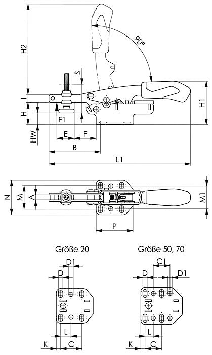 № заказа | Размер | F1 [kN] | Автоматическое выравнивание высоты S [мм] | Максимальная выравнивание высоты [мм] | Зажимной винт | Вес [г] |