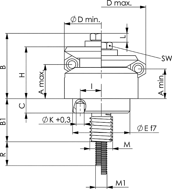 При заглубленной установки D макс. должно быть предусмотренно для освобождения устройства. Рекомендации по монтажу: Стопорный штифт для точного определения положения конуса.