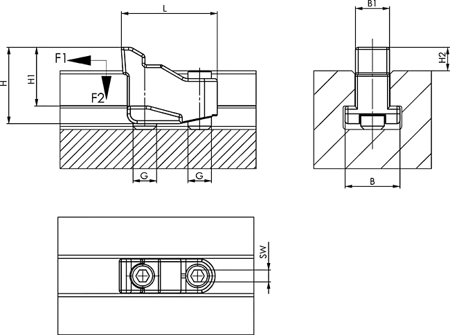 № заказа | Размер | Паз | F1 [кН] | F2 [кН] | H2 | SW [мм] | Вес [г] |