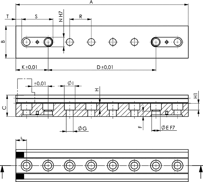 Ширина направляющей может быть двух размеров - 50, 80 мм. Расстояние между отверстиями 40 мм. Закаленный 60 HRC, сплайны 1 мм. Подходит для всех систем подачи AMF: шаг 40 мм, M12, ø16 F7.