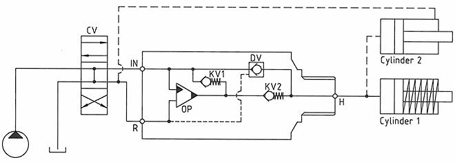 Основная операция показана на функциональной схеме. Масло подается через направляющий клапан CV в порт IN и свободно течет через обратные клапаны KV1, KV2 и DV на сторону высокого давления H. В этом случае достигается максимальный поток через усилитель, обеспечивающий функцию ускоренной перемотки вперед.